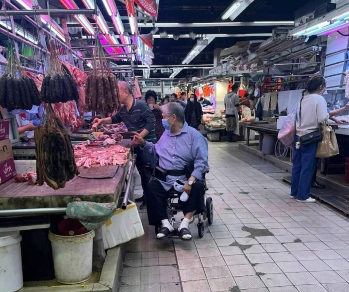2025年4月7日,香港石湖墟街市的猪肉摊前,洪金宝的电动轮椅碾过湿漉漉的地面。他穿着褪色蓝条纹衬衫,膝盖盖着格子毛毯,左手捏着手机,右手在案板上翻动猪肉。他操着沙哑的粤语,手指精准点在五花肉的分界线上。摊主递过塑料袋时,他还跟摊主讨价还价,引得周围顾客哄笑。
